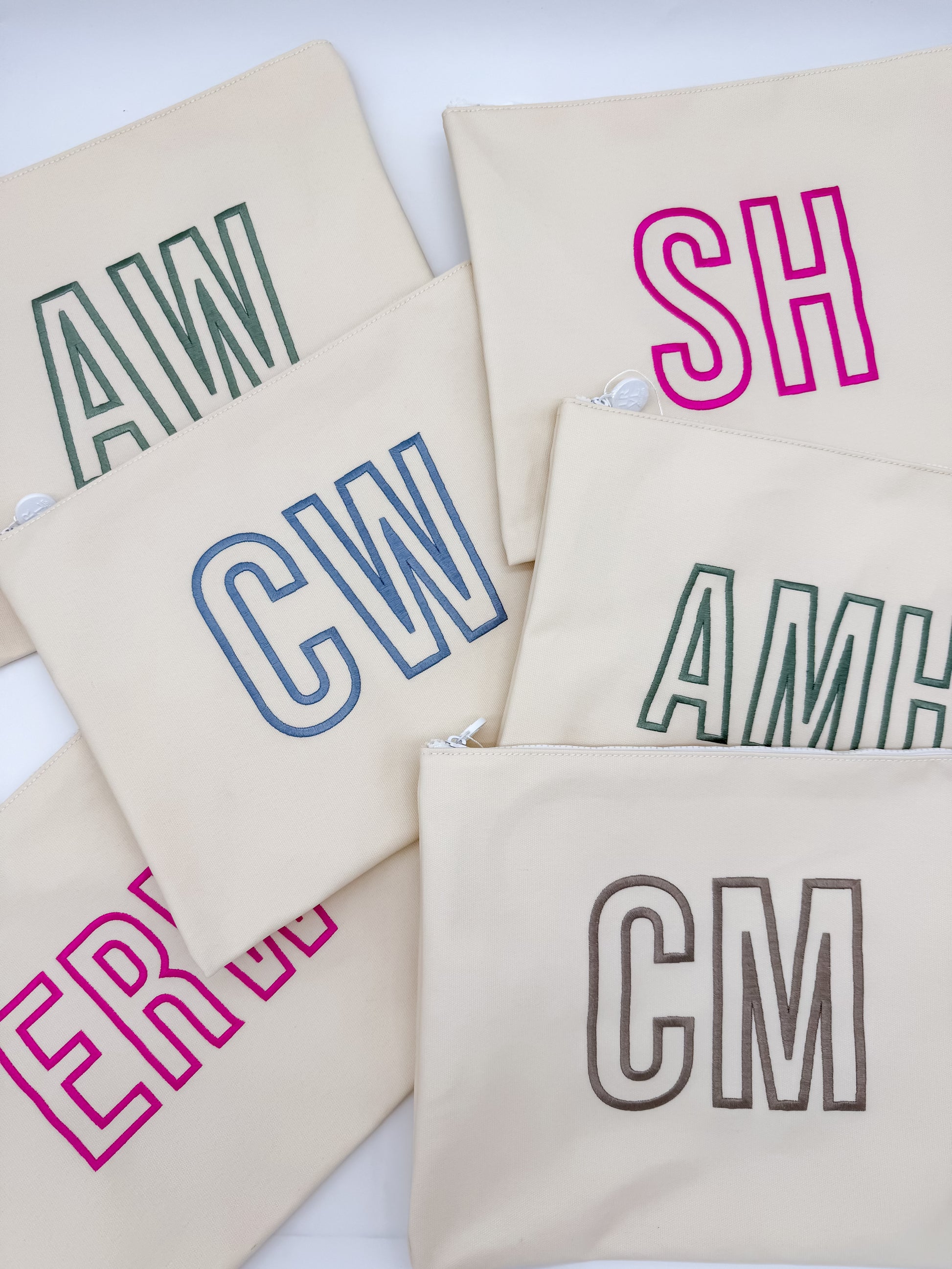 Our best selling coated canvas pouch meets giant initials! Choose from two or three initial styles in four different colors, taupe (CM), hot pink (ERW & SH), slate blue (CW) and sage green (AMH). We can't wait to see what you create!